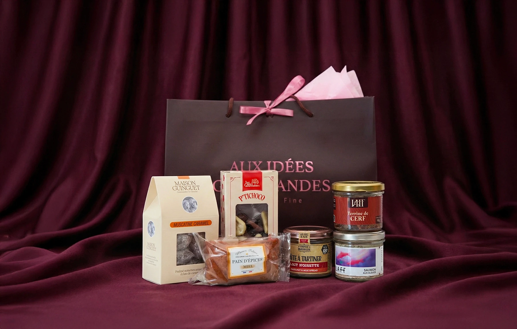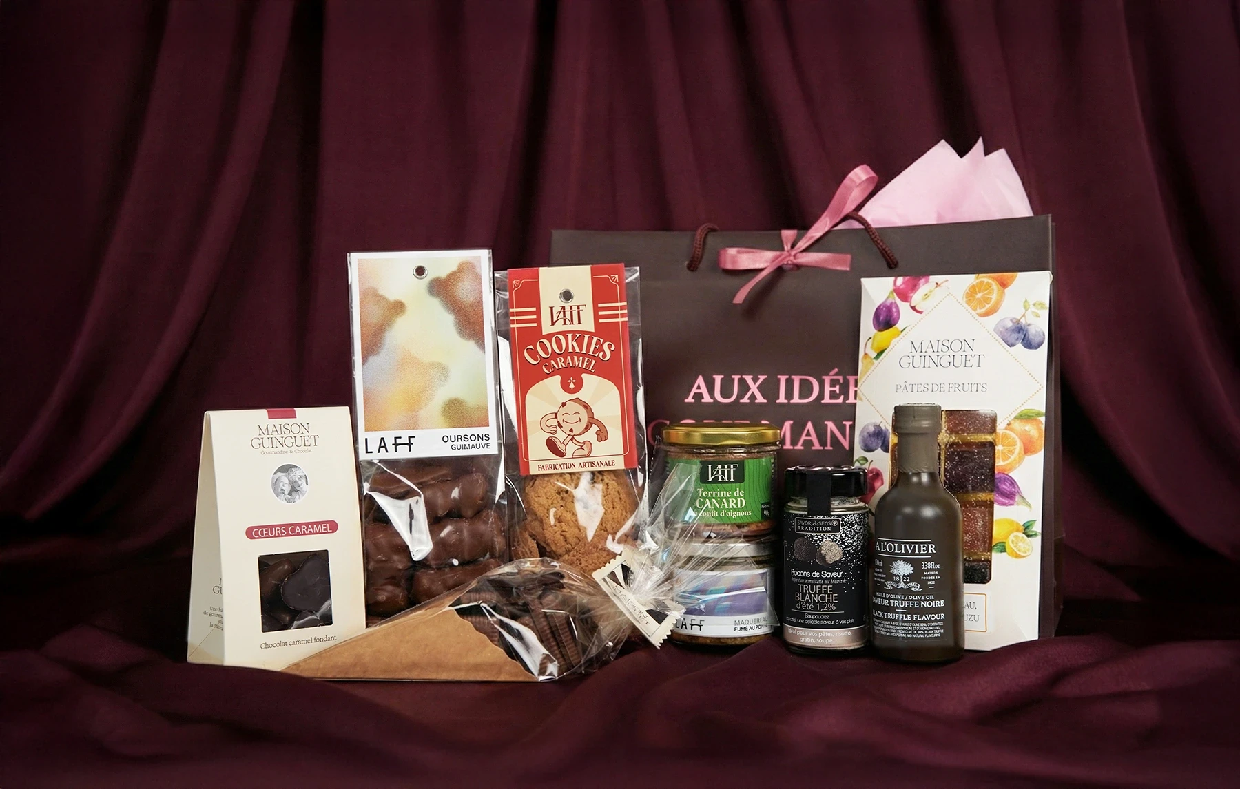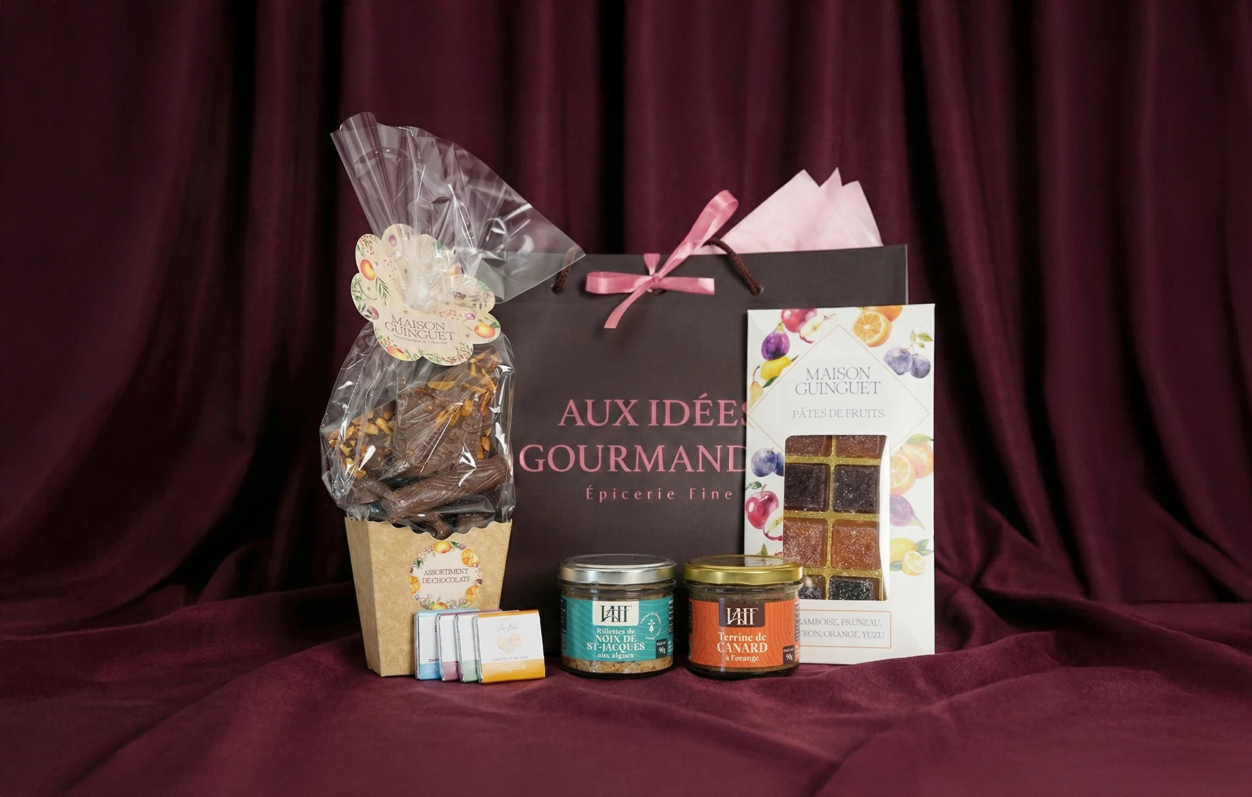 Savourez l'alliance des noix de Saint-Jacques aux algues, de la terrine de canard à l'orange et des douceurs Maison Guinguet & Dolfin. Un coffret complet et raffiné.