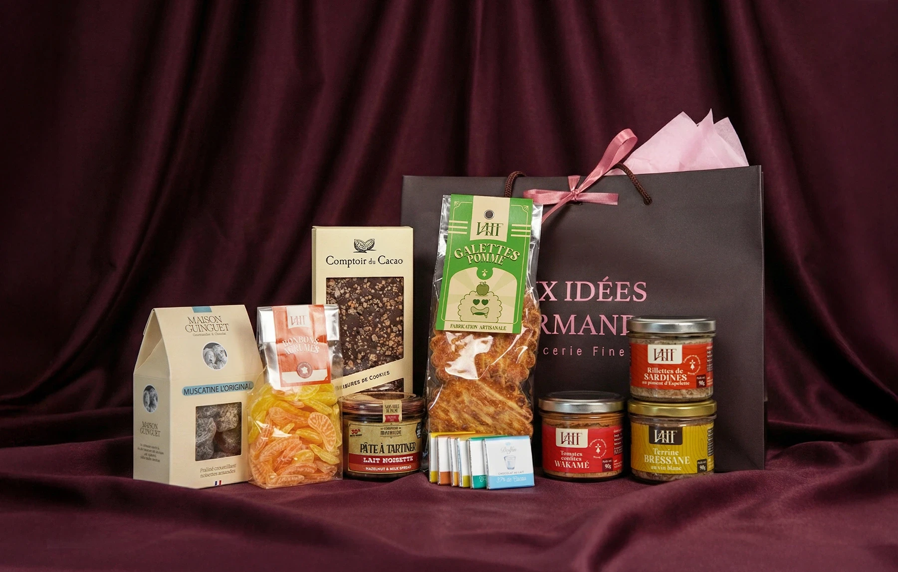Un voyage gourmand mêlant rillettes marines, terrine bressane et douceurs artisanales (chocolat, galettes, bonbons). La générosité du terroir dans un seul écrin.